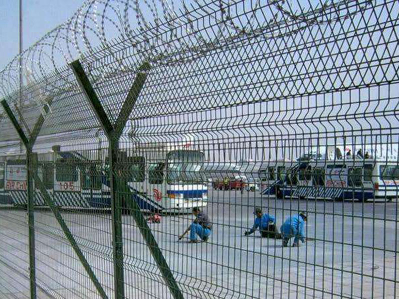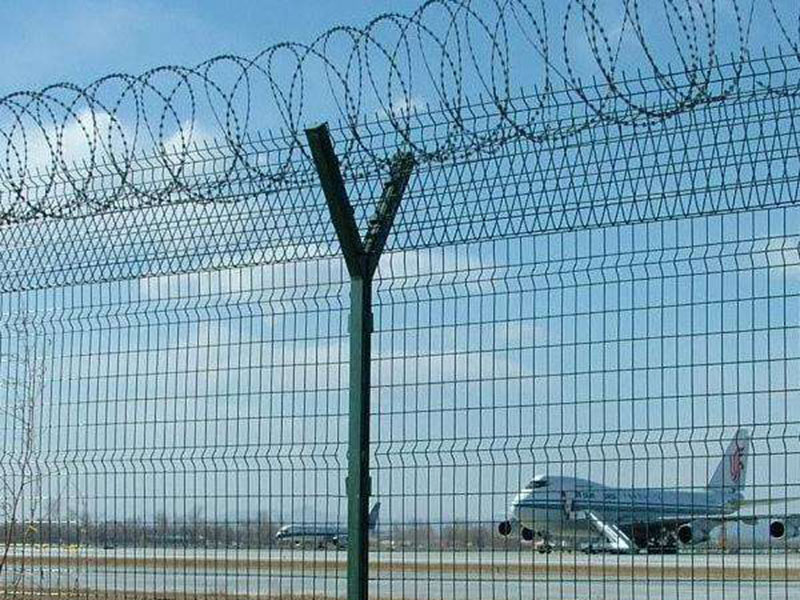 Y字形機(jī)場(chǎng)護(hù)欄網(wǎng),遠(yuǎn)遠(yuǎn)看去表面形式類似于一個(gè)大寫的Y字,因此得名于Y字型圍欄,是由V型支架立柱,加強(qiáng)型焊接片網(wǎng),安全防盜連接件和熱鍍鋅刀片刺網(wǎng)組成強(qiáng)度和安全防御性級(jí)別很高。近年來,被廣 泛應(yīng)用在機(jī)場(chǎng),軍事基地等高安全場(chǎng)所。其表現(xiàn)的防護(hù)、安全性能格外突出。